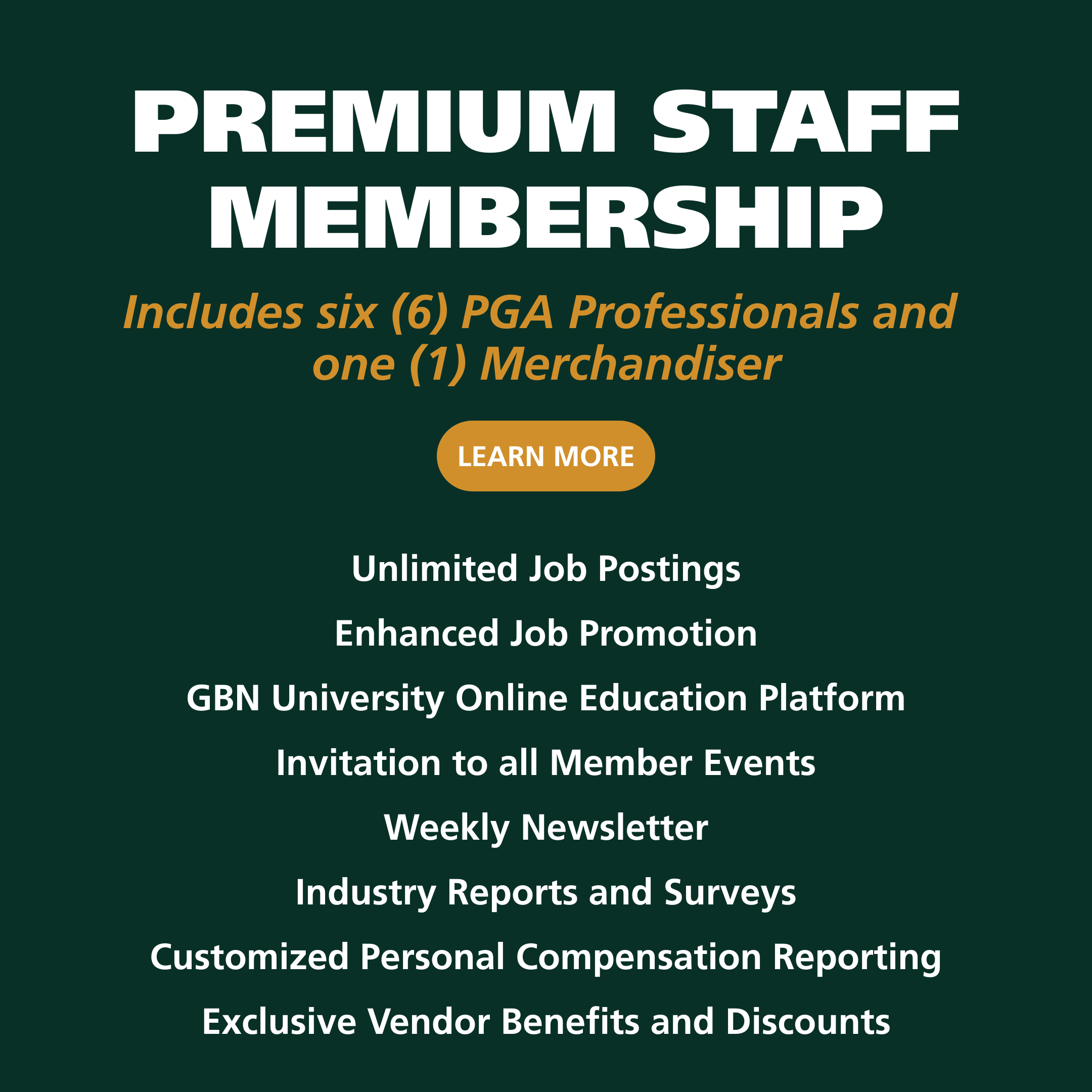 Our extensive network of over 2,200 members across 750 clubs worldwide, GBN connects you with industry leaders to expand your professional reach. We offer robust career support through a comprehensive job board, contingent recruitment, and executive search services to help you hire top talent or advance your career. Our detailed compensation reports and industry surveys provide data-driven insights to optimize salary structures and maintain a competitive edge. Join us at over 12 annual in-person networking events to forge meaningful connections, enhance your personal brand, and deepen your industry knowledge. Sharpen your skills with GBN University, our online platform offering practical, industry-relevant classes tailored for golf professionals. Plus, enjoy exclusive vendor discounts through partnerships with leading brands, designed to maximize value for our members.